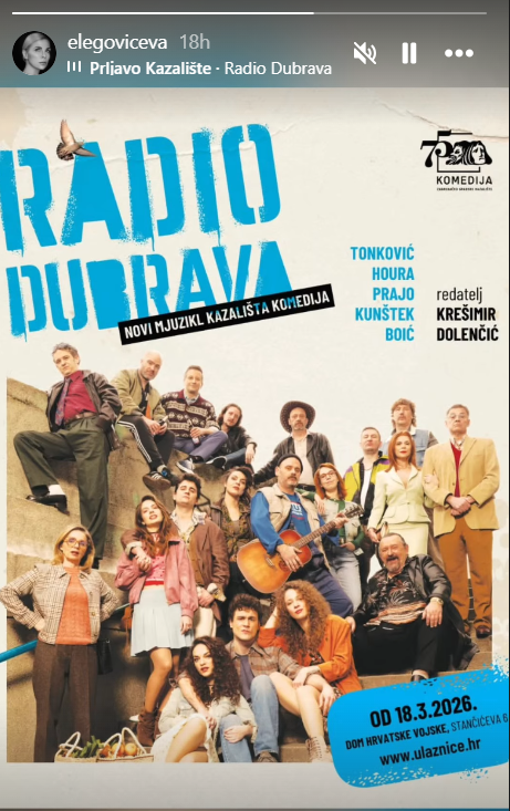 Glumica Mila Elegović na svojim je društvenim mrežama najavila novi mjuzikl Kazališta Komedija pod nazivom 'Radio Dubrava', nastao po motivima glazbe grupe Prljavo kazalište.