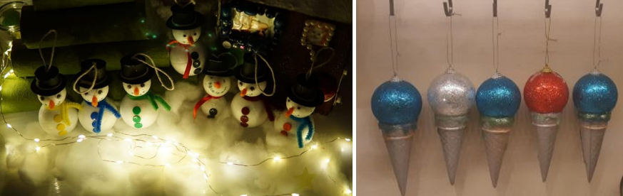 “Šeširi su napravljeni od kartona, gumbići su pribadače, neki imaju svilene trake za šal, a osmijeh je nacrtan crnim flomasterom. Ovog malog snješka s crvenim šalom je napravio moj Matej, a ja sam mu pomogla samo sa šeširom”, ponosno je istaknula ova mama i dodala kako je kornete bojala sa sprejom, a koristila je kuglice iz dućana koje je lijepila vrućim ljepilom.