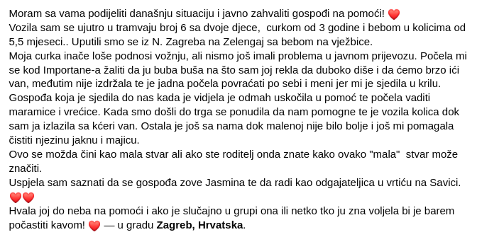 "Gospođa koja je sjedila do nas, kada je vidjela, je odmah uskočila u pomoć te počela vaditi maramice i vrećice. Kada smo došli do trga ponudila se da nam pomogne te je vozila kolica dok sam ja izlazila s kćeri van. Ostala je još s nama dok malenoj nije bilo bolje i još mi pomagala čistiti njezinu jaknu i majicu. Ovo se možda čini kao mala stvar, ali ako ste roditelj onda znate kako ovako 'mala' stvar može značiti", napisala je ova mama, dodajući kako je saznala da je žena koja je uskočila pomoć odgajateljica u vrtiću i da bi je htjela počastiti kavom.