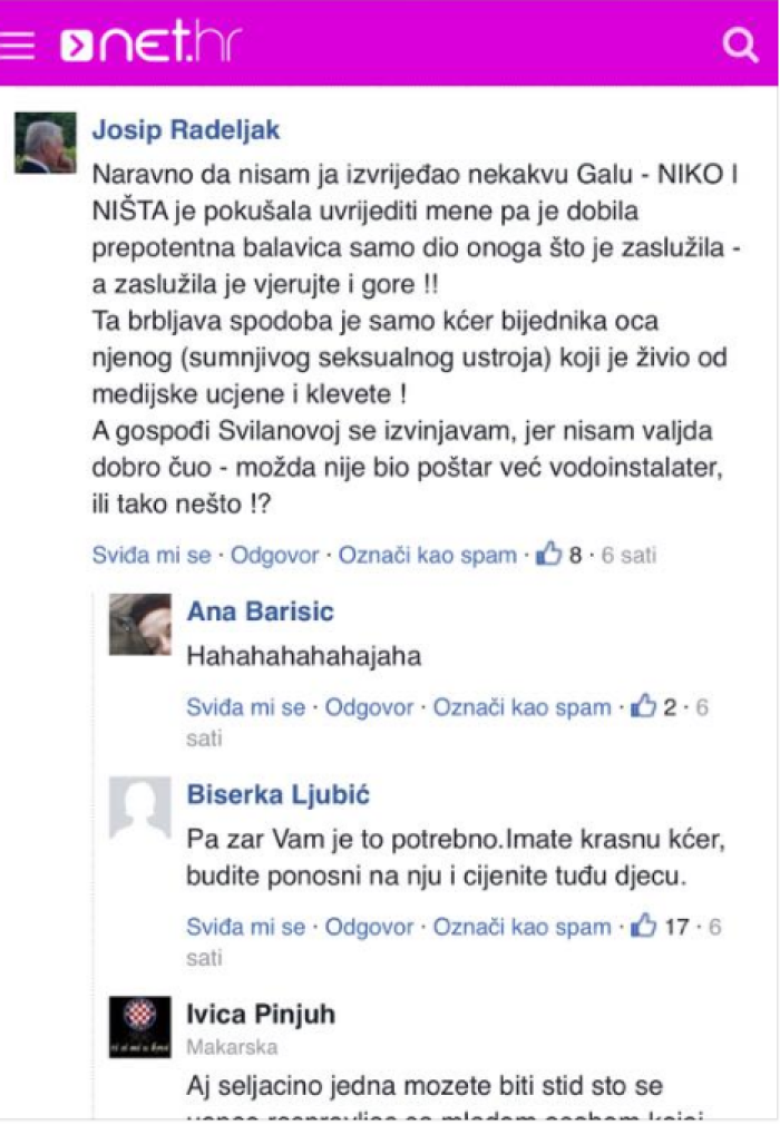 "Naravno da nisam ja izvrijeđao nekakvu Galu – NIKO I NIŠTA je pokušala uvrijediti mene pa je dobila prepotentna balavica samo dio onoga što je zaslužila – a zaslužila je vjerujte i gore!! Ta brbljava spodoba samo je kći bijednika oca njenog (sumnjivog seksualnog ustroja) koji je živio od medijske ucjene i klevete! A gospođi Svilanovoj se izvinjavam, jer nisam valjda dobro čuo –možda nije bio poštar već vodoinstalater, ili tako nešto", napisao je Radeljak.