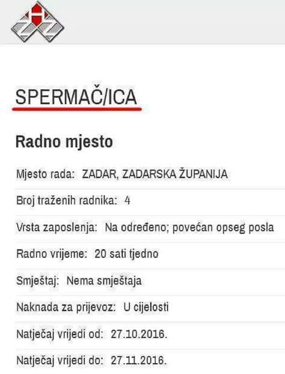 Tipfeler koji mijenja sve: HZZ na svojim stranicama traži 'spermačicu'
