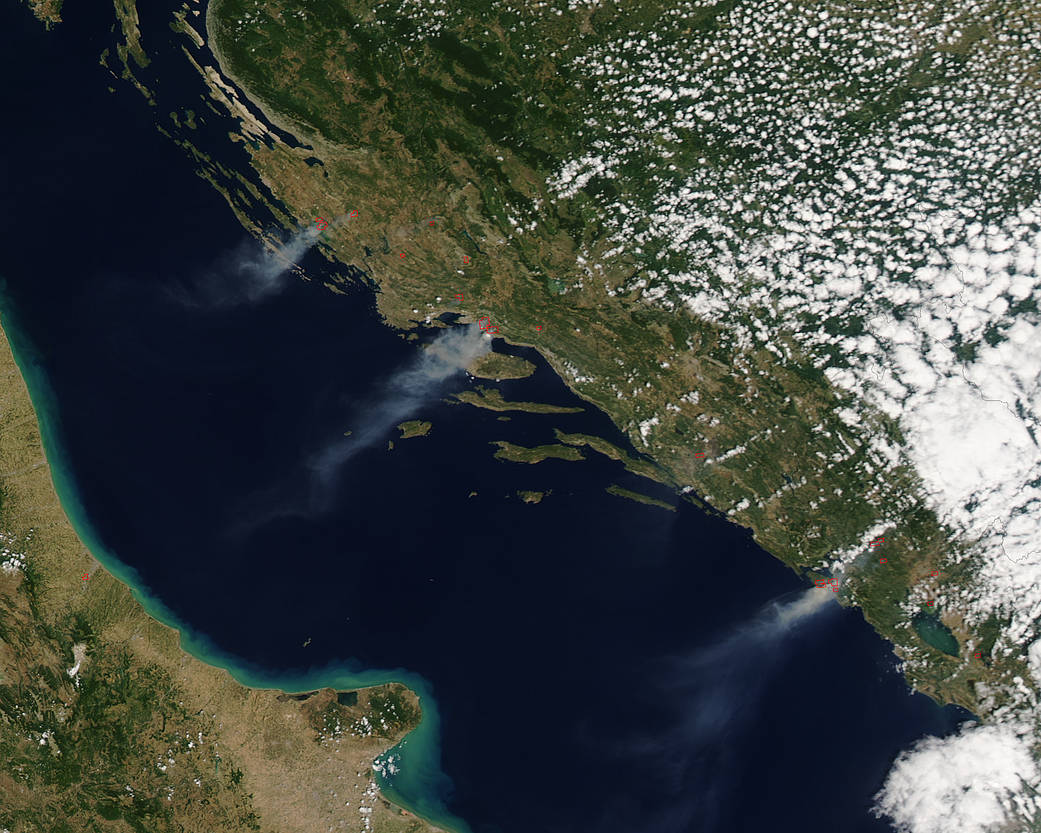 NASA je objavila fotografije satelita Aqua koji je, kako navode uočio i fotografirao zastrašujuće prizore požara u Hrvatskoj i Crnoj gori, na obali Jadranskog mora. Snimka je nastala 17. srpnja.