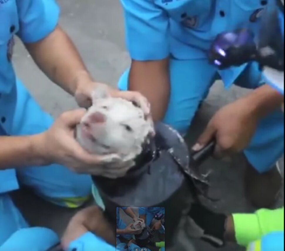 Ali, onda su došli spasitelji, pažljivo i uz puno truda rastalivši cijev, kako bi izvukli malenoga iz zarobljeništva.