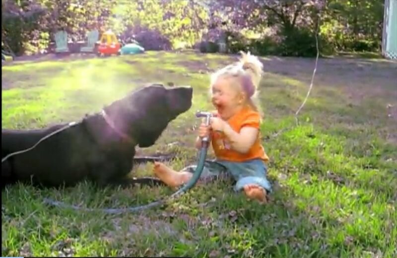Snimka prikazuje slatku djevojčicu koja u igri prska psa vodom, a svaki put kada on odreagira, djevojčica 'pukne' od smijeha.