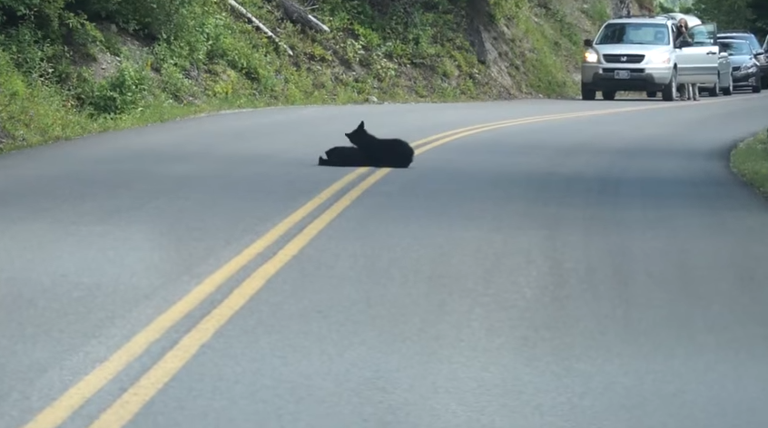 Začuđeni vozač morao je zaustaviti automobil nakon što je na cesti ugledao nešto crno, a ostali vozači koji su se u tom trenutku našli u Nacionalnom parku ledenog glečera u Montani snimali su nesvakidašnji prizor.