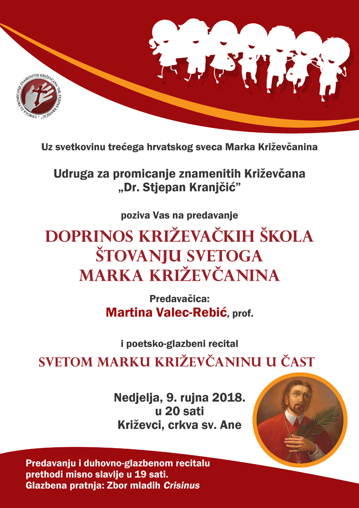 "Doprinos križevačkih škola štovanju sv. Marka Križevčanina" - naziv je predavanja prof. Martine Valec-Rebić koje će biti održano u nedjelju 9. rujna u 20 sati u župnoj crkvi sv. Ane u Križevcima.