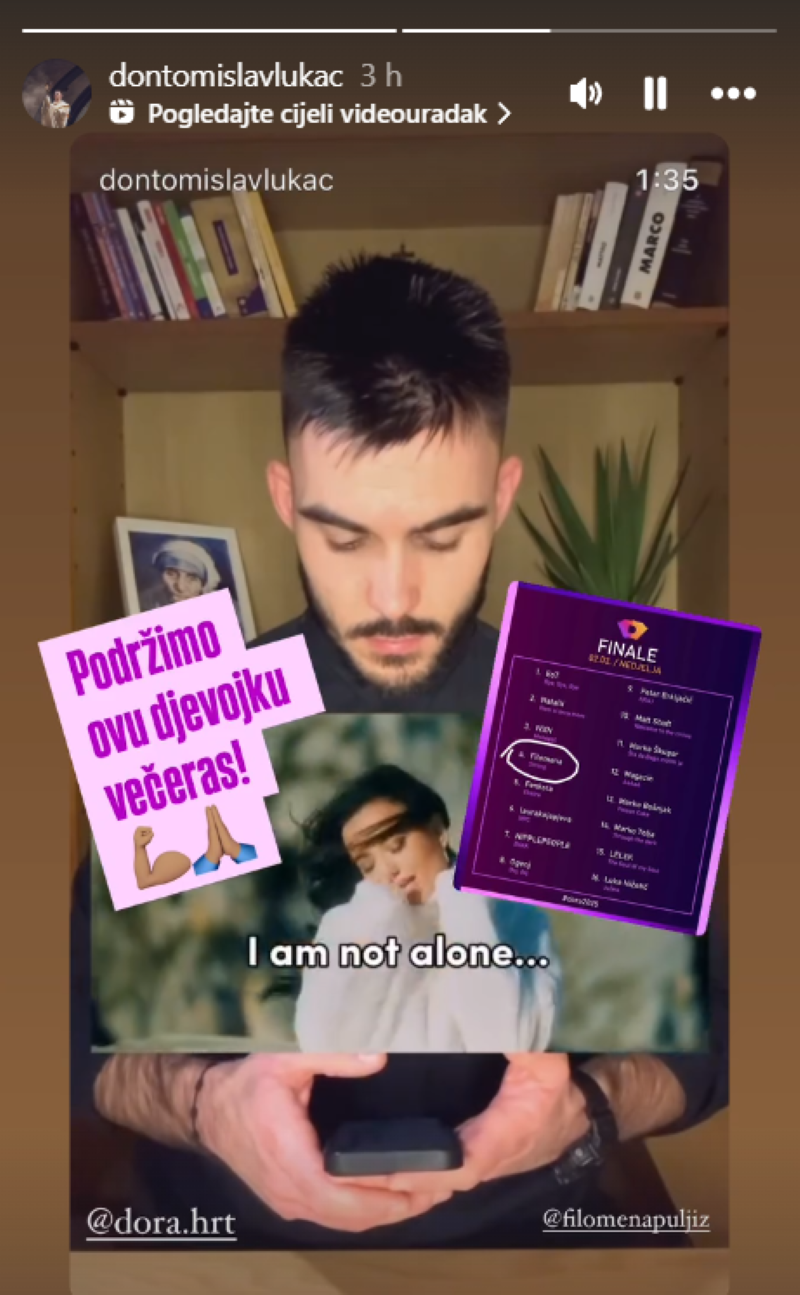 Poznati svećenik don Tomislav Lukač na svom Instagram profilu također je podijelio ovu objavu te potaknuo ljude da glasaju upravo za Filomenu u finalu. Podsjetimo, ovaj salezijanac je već ranije otkrio da mu je Filomena Puljiz sa svojom pjesmom 'Strong' favorit te joj posvetio jednu objavu.
