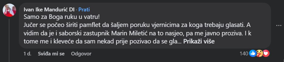"Jučer se počeo širiti pamflet da šaljem poruku vjernicima za koga trebaju glasati. A vidim da je i saborski zastupnik Marin Miletić na to nasjeo, pa me javno proziva. I k tome me i kleveće da sam nekad prije pozivao da se glasuje za Penavu ili Ćipu", napisao je pater na svojim društvenim mrežama. Nastavio je s porukom političaru.
