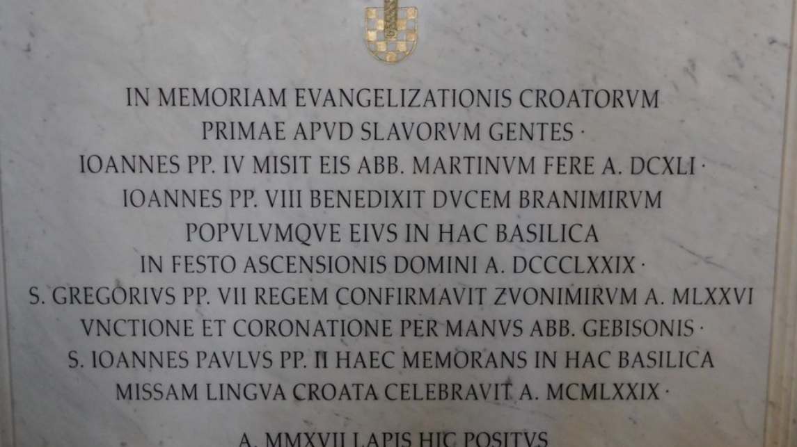 IN MEMORIAM EVANGELIZATIONIS CROATORVM PRIMAE APVD SLAVORVM GENTES • IOANNES PP. IV MISIT EIS ABB. MARTINVM FERE A. DCXLI • IOANNES PP. VIII BENEDIXIT DVCEM BRANIMIRVM POPVLVMQVE EIVS IN HAC BASILICA IN FESTO ASCENSIONIS DOMINI A. DCCCLXXIX • S. GREGORIVS PP. VII REGEM CONFIRMAVIT ZVONIMIRVM A. MLXXVI VNCTIONE ET CORONATIONE PER MANVS ABB. GEBISONIS • S. IOANNES PAVLVS PP. II HAEC MEMORANS IN HAC BASILICA MISSAM LINGVA CROATA CELEBRAVIT A. MCMLXXIX • A.MMXVII LAPIS HIC POSITVS FRANCISCO SVMMO PONTIFICE.