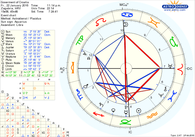 Horoskop hrvatske Vlade obiluje izazovnim aspektima - kvadratima, ali kad sagledamo širu sliku (Republika Hrvatska je članica EU i NATO-a, op.a.), uz pametne gospodarske poteze, doduše stroge, situacija se može izvući. Tibetanci, Indijci, Japanci i Kinezi (njihovi Astrolozi, op.a.), kad im se spomenu kvadrati u našoj zapadnoj Astrologiji, odgovaraju: "Teški aspekti čeliče situaciju i pogoduju promjenama na bolje". To je istina i u to sam se kao Astrolog uvjerio.