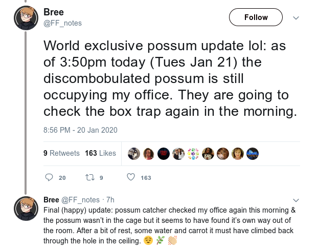 Na svom tvitu rekla je kako joj je bilo žao životinje koja je pala kroz strop i zaglavila u uredu pa ju je nahranila i dala joj vode. Pozvala je relevantne ljude na kampusu kako bi riješili ovaj slučaj. Spustila je i rolete kako bi se australski oposum odmorio. Služba za zaštitu životinja postavila je zamku kako bi ulovila životinju.