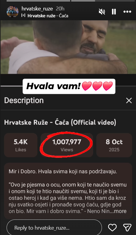 Tom su se impresivnom brojkom pohvalili i članovi Hrvatskih ruža na svom službenom profilu. "Hvala vam", poručili su uz objavu kojom su pokazali koliko ih je razveselila velika podrška publike.