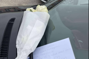 Naime, na prednjem staklu jednog automobila ostavljeno je cvijeće i rukom napisana poruka: "Volim te ljubavi, ne budimo tvrdoglavi, uzmi ovo cvijeće od muža što te nikad pustit neće."