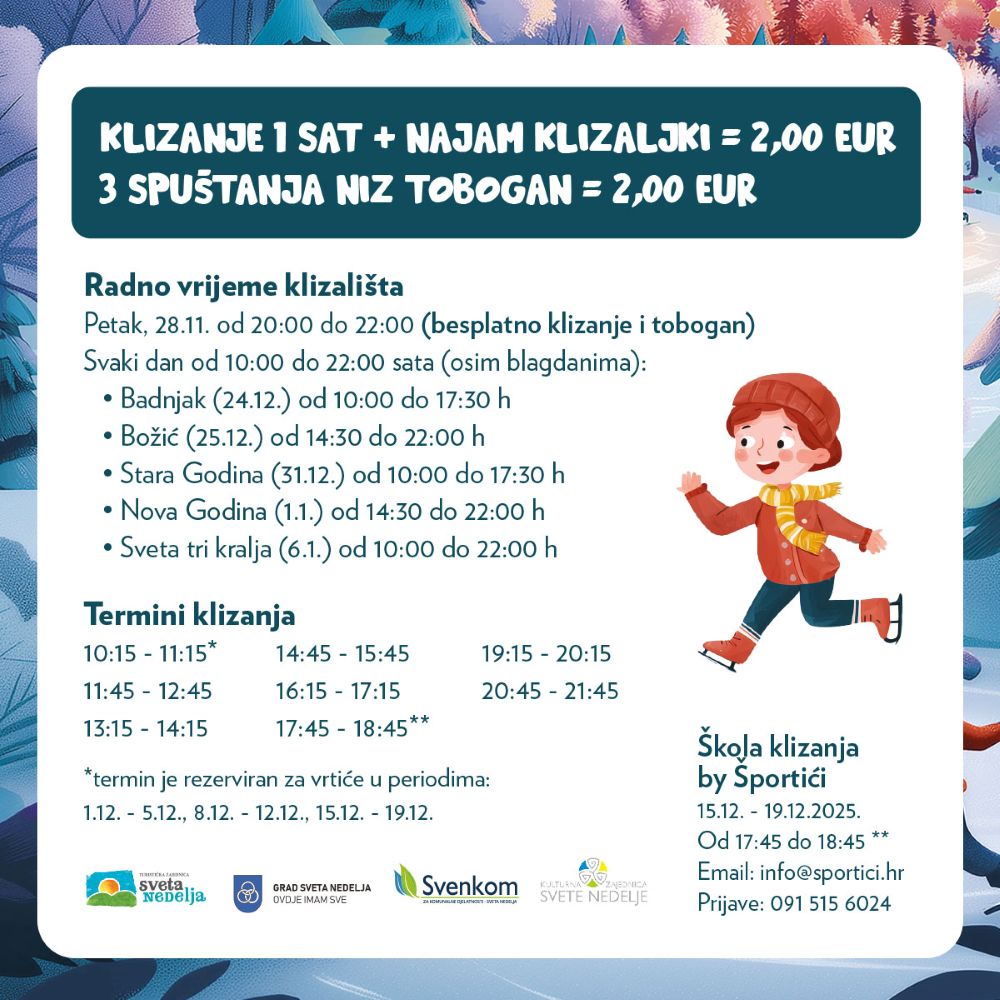 "I ove godine Advent u Svetoj Nedelji donosi bogat program za sve generacije pa ne propustite zajedničko paljenje svijeća na adventskom vijencu, Veselu klizaonicu i Dječju olimpijadu, kreativne radionice i brojne druge aktivnosti za djecu i mlade. Okupite najdraže i uživajte u blagdanima uz sjajne božićne koncerte i nezaboravne tulume s Mineom, Joletom i Mejašima", dodali su. "Vidimo se na Zimskim cajtima. Ulaz slobodan."