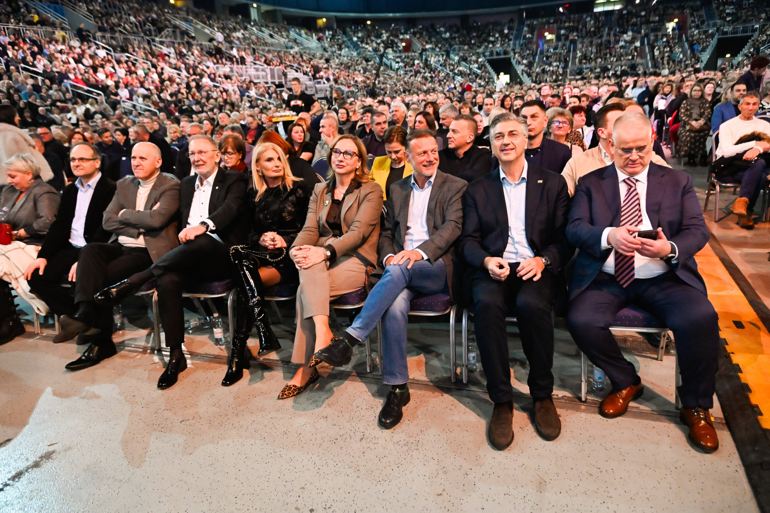 U prvim redovima sjedili su visoki politički dužnosnici. Među njima su bili predsjednik Vlade Andrej Plenković, predsjednik Hrvatskog sabora Gordan Jandroković koji je na koncert stigao sa suprugom Sonjom, te ministri Davor Božinović, u pratnji supruge Jasne, i Branko Bačić.